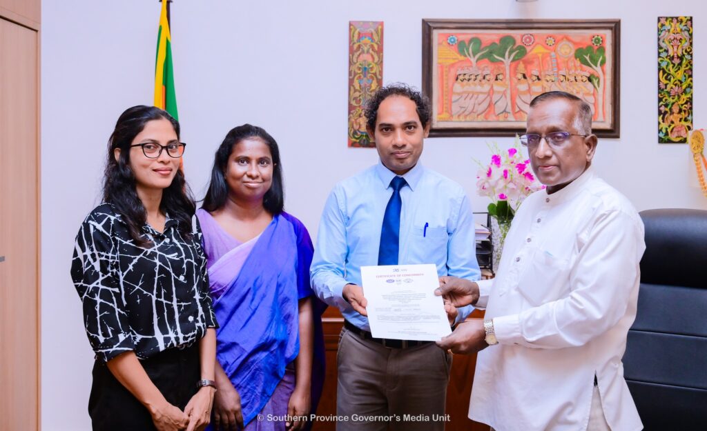The Ministry of Agriculture, Agrarian Development, Irrigation, Water Supply and Drainage, Food Supply and Distribution, Trade and Cooperative Development of the Southern Province has been awarded the ISO 9001:2015 Quality Certificate. This certificate has been awarded due to the recognition of the above Ministry by the Sri Lanka Standards Institutions that it provides services in accordance with international standards. The relevant quality certificate was presented by the Hon. Governor of the Southern Province, M.K. Bandula Harischandra, to the Secretary of the Ministry, Mr. C.C. Muhandiram, on 2025.03.27 at the Southern Province Governor’s Secretariat. Assistant Secretary of the Ministry, Ms. D.N. Chamini, Development Officer, Miss. Ishara Pathirana were also present on this occasion.